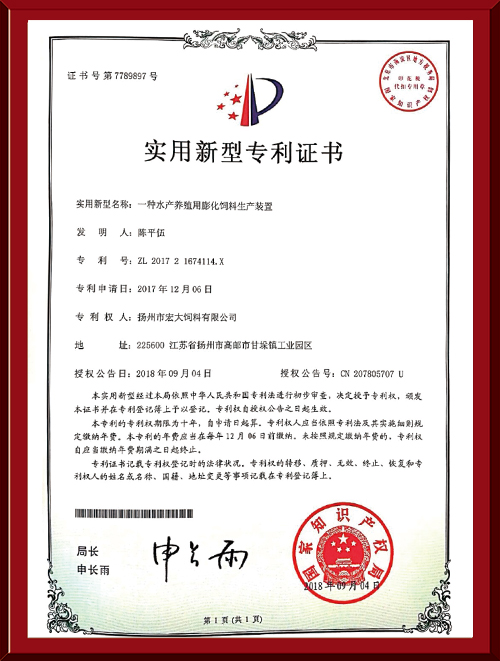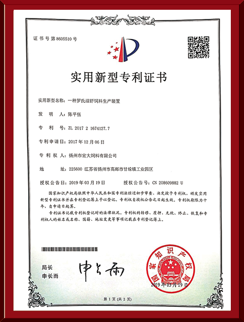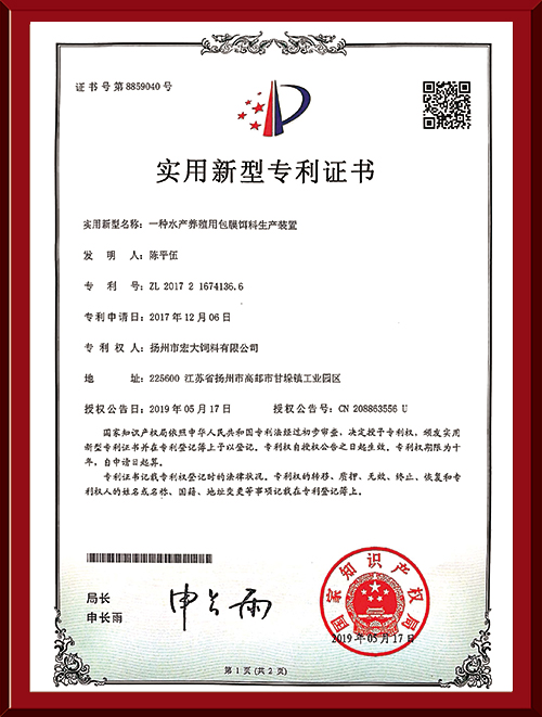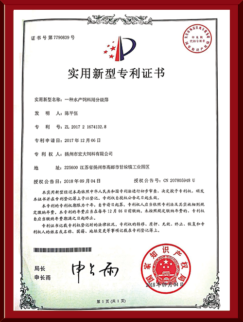 揚州市宏大飼料有限公司 揚州市宏大飼料有限公司是一家集科研與生產(chǎn)為一體的大型民營企業(yè),座落在魚米之鄉(xiāng)高郵東郊,傍依郵興公路、澄子河,水陸交通便捷,于2002年建成投產(chǎn),占地面積60畝,固定投資1.5億元?,F(xiàn)有7條生產(chǎn)線,其中時產(chǎn)15噸高檔水產(chǎn)膨化生產(chǎn)線2條,均采用國內(nèi)先進的真空后噴涂技術(shù)和低溫烘干技術(shù)(飼料內(nèi)的各種營養(yǎng)不受破損)、臺灣宜大高檔蝦料生產(chǎn)線2條和魚飼料生產(chǎn)線3條。
